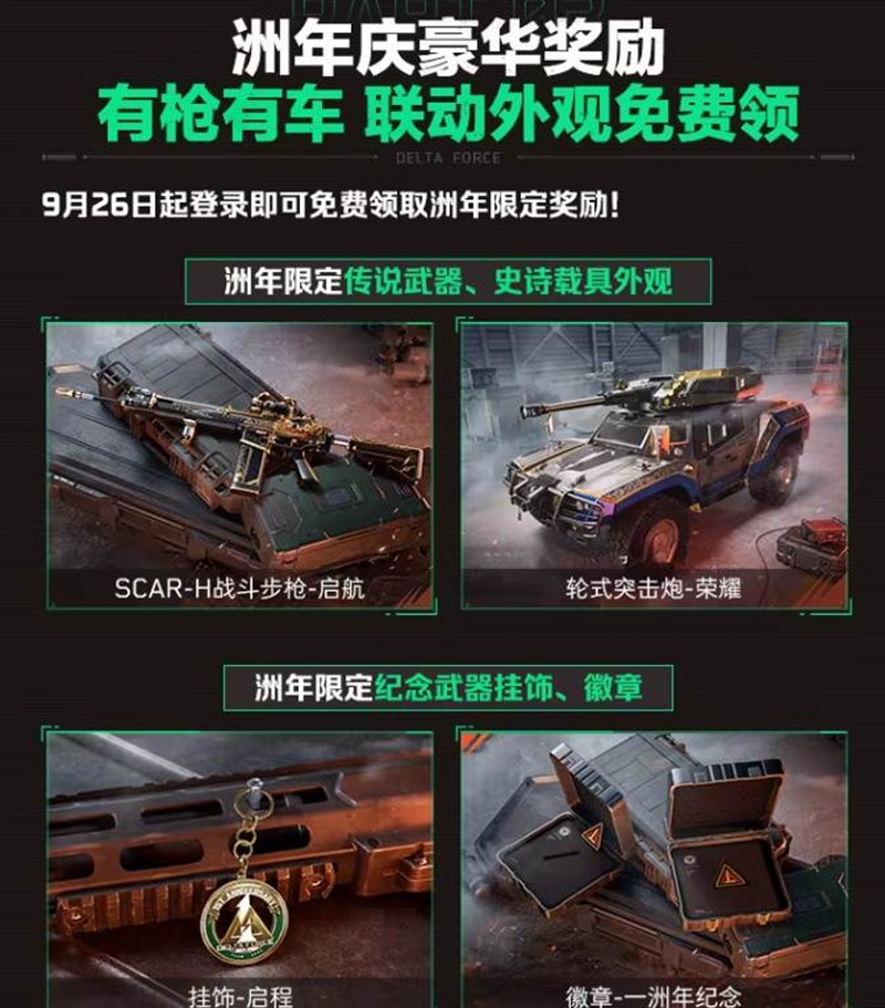 三角洲行动为庆祝国庆假期,特别推出了一系列限时福利活动,让玩家们在假期中享受更多的游戏乐趣。从9月29日开始,游戏将带来全新的死斗模式晋升之路,以及丰富的奖励,包括限时三角券、传说武器、史诗载具外观等。