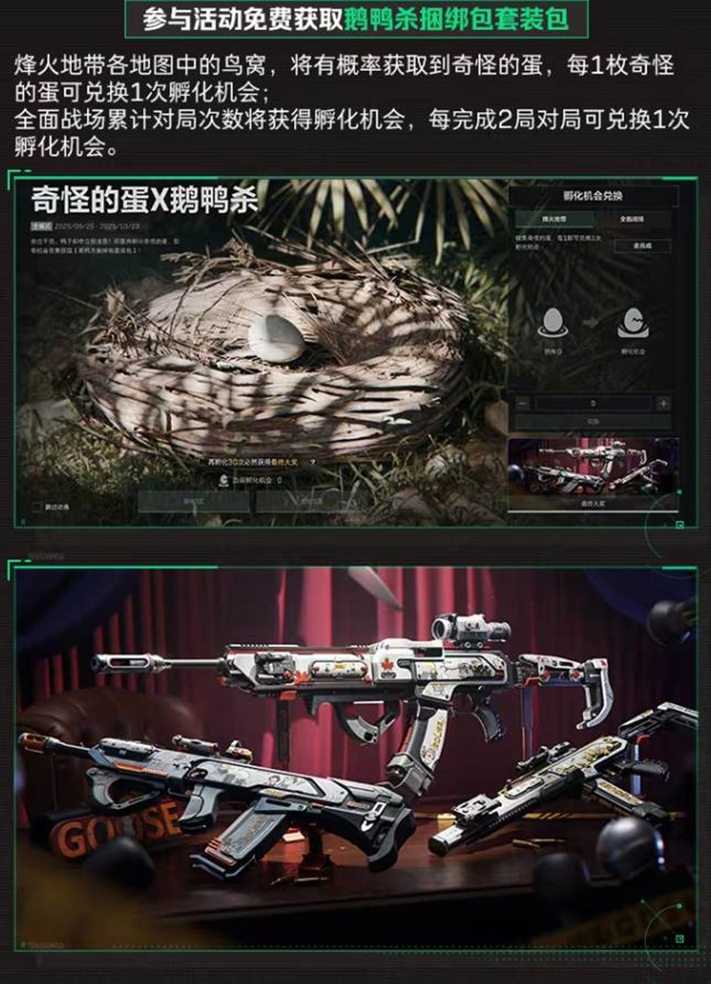 参与活动免费获取鹅鸭杀捆绑包套装包,烽火地带各地图中的鸟窝,将有概率获取到奇怪的蛋,每1枚奇怪的蛋可兑换1次孵化机会;全面战场累计对局次数将获得孵化机会,每完成2局对局可兑换1次孵化机会。
