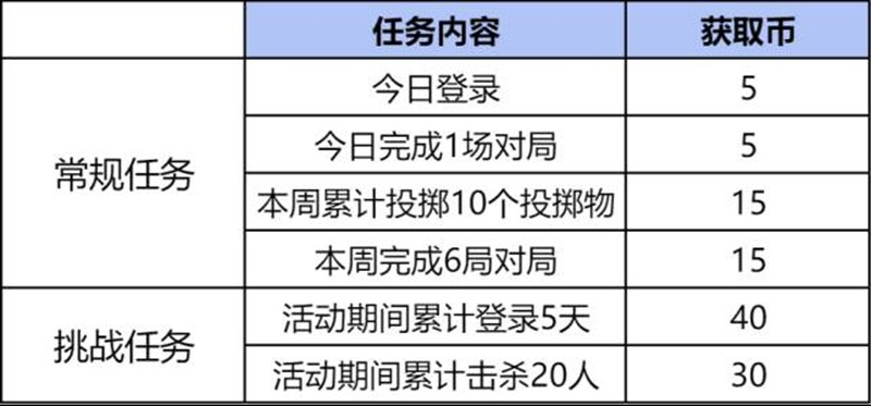 兔兔中秋礼活动持续时间为10月6日-10月26日。活动时间共计21天,三个自然周,时间比较充裕,正常完成任务可以轻松拿下沙鹰-宇航兔兔和闪光弹-宇航兔兔。任务分为常规任务和挑战任务,常规任务包括今日登录、今日完成1场对局、本周累计投掷10个投掷物和本周完成6局对局,挑战任务包括活动期间累计登录5天和活动期间累计击杀20人。10币抽取一次,想要拿下沙鹰-宇航兔兔和闪光弹-宇航兔兔所有奖励共计需要140个币,任务详情见下图。