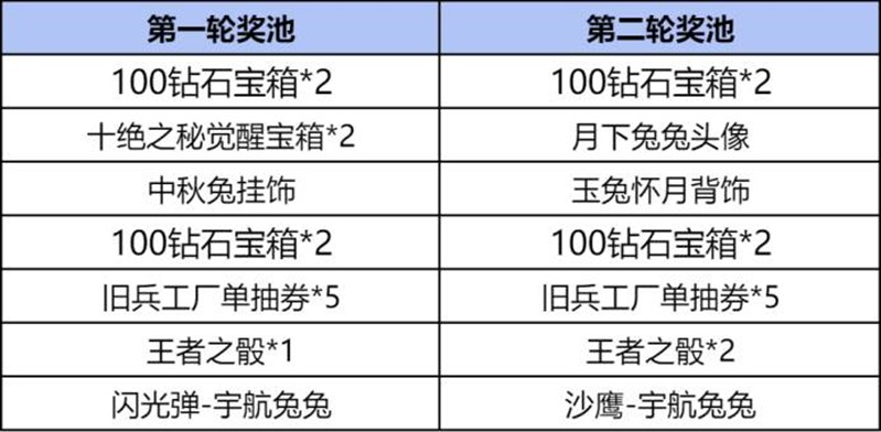 兔兔中秋礼活动分为两个奖池,第一轮奖池完成所有可以拿下闪光弹-兔兔。完成第二轮奖池可以拿下沙鹰-宇航兔兔,其他奖励比较丰富,钻石和王者之骰等福利道具都可免费获取,详情见下图。
