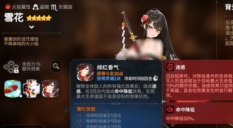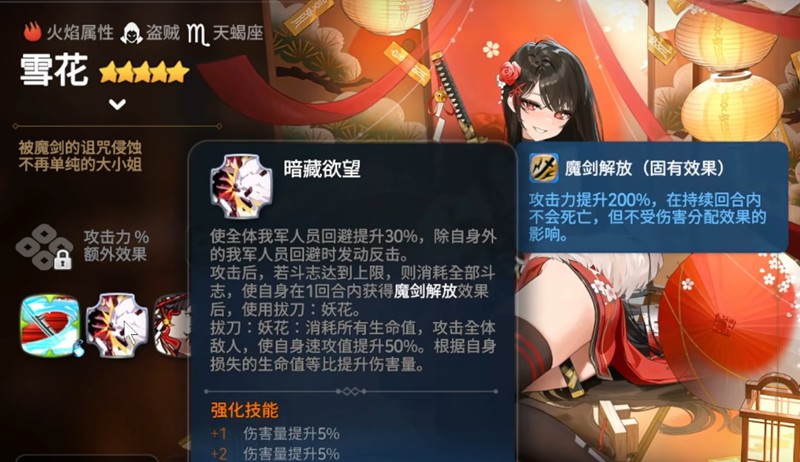 雪花的二技能暗藏欲望是她整个战斗体系的核心。该技能为被动效果,能够为包括雪花在内的全体友军提供30%的回避率加成。每当除雪花外的任意友军成功闪避敌方攻击后,雪花便会立即发动一次反击,这次反击不仅能对目标造成伤害,还能为她自身积累斗志。每当斗志积满,雪花将触发魔剑解放状态,在此状态下她会消耗全部生命值,对敌方全体发动一次高额群体伤害,且伤害量与所消耗的生命值成正比。这一机制使得雪花在残局阶段具备极强的爆发能力,也是她在第七史诗中被称为“自爆卡车”的主要原因。