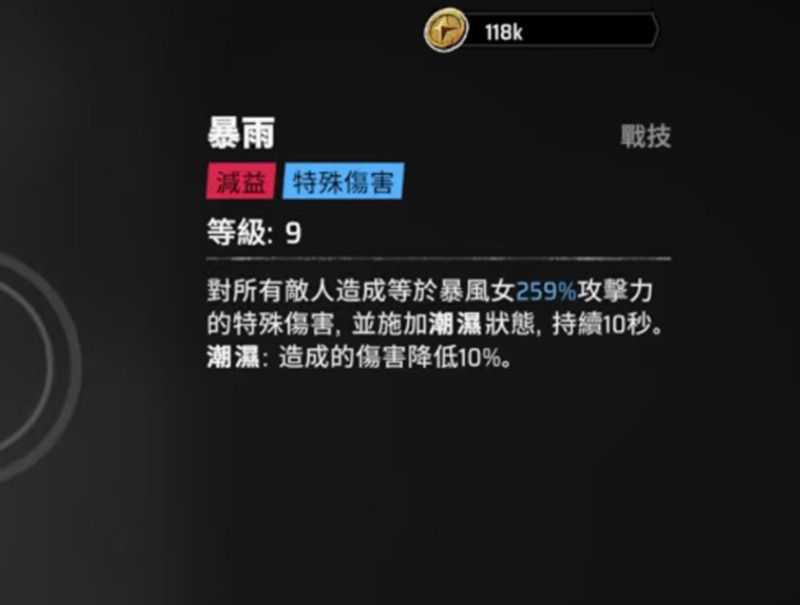 该技能释放后会对目标造成特殊类型伤害,并附加持续10秒的潮湿状态。处于潮湿状态下的敌人,其对己方单位造成的伤害会有所降低。这一机制不仅提升了团队生存能力,也为后续技能衔接创造了条件。潮湿状态的存在为暴风女的下一次技能冰雹提供了触发基础,是技能循环中的关键一环。