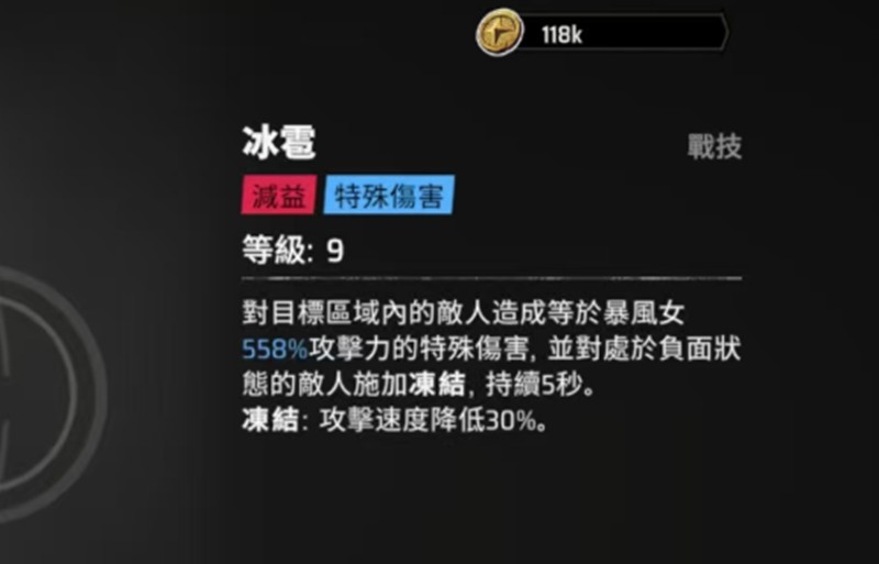 此技能作用于指定区域内的所有敌人,造成特殊伤害的同时,若目标已处于负面状态,则额外触发5秒冻结效果。冻结期间敌人的攻击速度也会受到削弱。配合暴雨先手施加的潮湿状态,可实现控制链的衔接。两个技能组合使用时,既能限制敌方输出节奏,又能为我方争取更多反击时间,在群体战斗中表现尤为突出。
