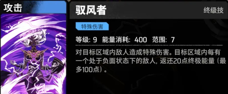 暴风女的终极技能名为御风者,释放时对范围内所有敌人造成大范围特殊伤害。若区域内存在处于负面状态的敌人,每有一名即可返还20点终极能量,最多可返还100点。虽然该技能需消耗400点能量,但凭借高返还机制,实际释放频率远高于普通射手。尤其是在面对多名带减益的敌人时,几乎可以实现技能循环连贯释放。