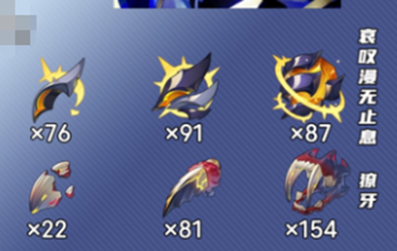 哀叹漫无止境材料在光锥和行迹培养中需求更大,需要76个蓝色品质、91个紫色品质和87个金色品质。狼牙材料则需要22个蓝色品质、81个紫色品质和154个金色品质,这些材料的收集需要玩家投入大量时间和精力。