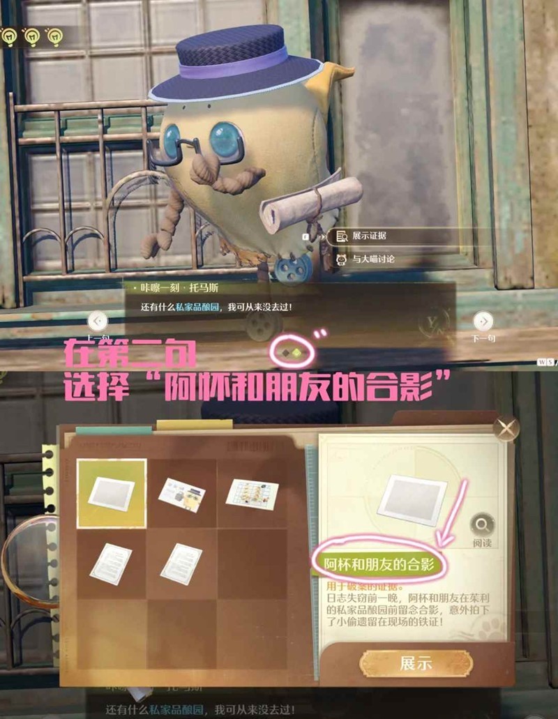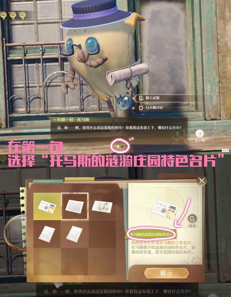 托马斯说到“丝巾”时展示证据,选择“托马斯的涟漪庄园特色名片”
