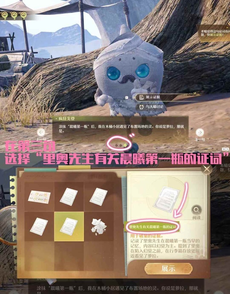 第一关第三句时展示证据,选择“里奥先生有关晨曦第一瓶的证词”