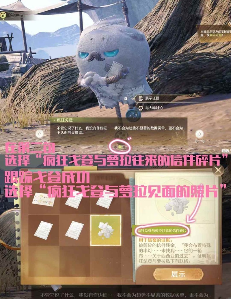 第二关第二句时展示证据,选择“疯狂戈登与萝拉往来的信件碎片”