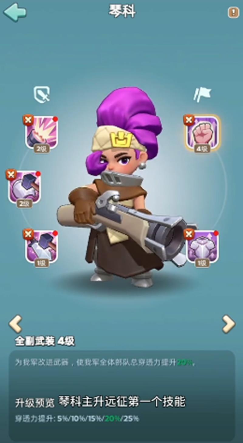 琴科的一技能是其核心技能,必须优先升级。该技能可为全队带来资源收益加成,无论是远程任务还是采集类活动,效率都会大幅提升。其余技能如远征、讨伐等可在后期逐步补足。前期集中资源将一技能点满,能显著加快发育速度,为后续阵容成型打下基础。在奔奔王国中,琴科的辅助定位明确,搭配霍华德、杰贝尔与狄安娜等角色,可组成一套兼顾生存、输出与资源获取的均衡阵容。