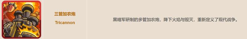 三管炮塔是前期最具压制力的炮塔之一。高额的爆发伤害使其成为清理成群小怪的首选。炮弹具备溅射效果,命中目标后可对周围敌人造成范围伤害。尽管攻速较慢,但每一次攻击都极具威胁,尤其在狭窄路径布置时,能最大化其清场效率。王国保卫战5中,三管炮塔常被用于关键岔路口的封锁。