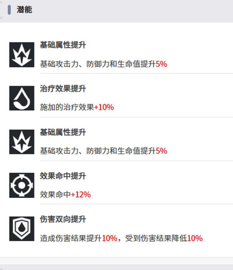 米娅拥有6层潜能系统,每层解锁都会带来属性或技能强化。第一层提升基础攻击、防御与生命各5%;第二层使治疗效果提升10%;第三层再次提升三项基础属性5%,与前两层叠加后总提升达10%;第四层增加12%效果命中;第五层提升10%伤害输出;第六层则在受到伤害时降低10%所受伤害。潜能全开后,米娅的辅助强度显著提升。