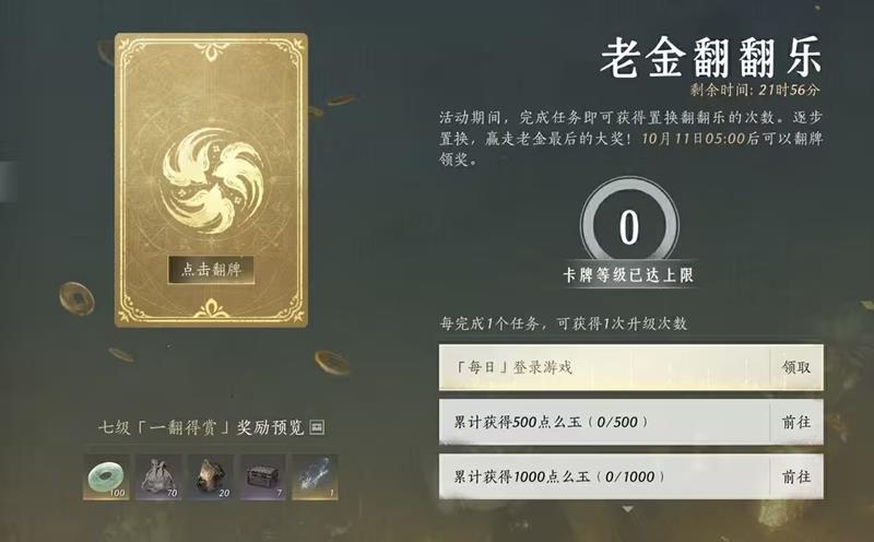 10月6日05:00-10月13日05:00,限时活动「老金翻翻乐」即将登场,翻牌置换赢大奖!活动期间,完成日常任务即可获得置换翻翻乐的次数,逐步置换,最终赢取老金备下的压箱好礼!参与活动将有机会获得【绕梁之音】、【心法心得·自选散本】、【长鸣玉】等丰厚奖励。