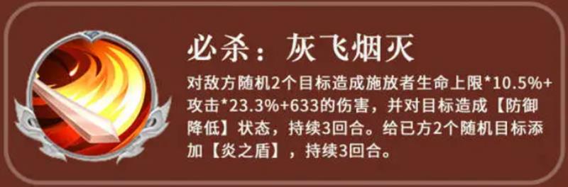 灰飞烟灭是周瑜的必杀技,释放时可对敌方随机两名目标造成基于自身生命上限10.5%的伤害,附加23%攻击力加633点固定伤害。该技能不仅具备可观的输出能力,还能使目标防御力下降,持续3个回合。与此同时,周瑜会为己方随机两名队友施加“炎之盾”,提供持续3回合的护盾保护。这一技能实现了攻守兼备的效果,在团战中既能压制敌方前排,又能增强己方生存能力。