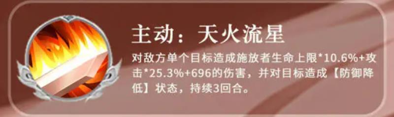 周瑜的主动技能名为天火流星,可对单个敌人造成高额伤害。伤害由三部分构成:自身生命上限的10%、攻击力的25%,以及696点额外伤害。该技能在造成输出的同时,也会使目标进入防御降低状态,进一步强化队伍的破盾效率。这一技能在面对高防御敌人时尤为有效,配合队友集火可快速瓦解敌方防线,是周瑜在关键时刻打出压制效果的重要手段。