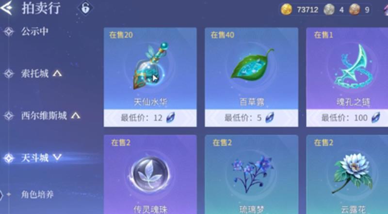 天斗城的拍卖行是前期最常接触的交易点之一,这里刷新的材料多与角色培养初期需求挂钩。魂性回溯、传灵魂珠、天仙水华等都是提升魂师资质的重要道具。这些物品在游戏前期尤为稀缺,直接影响进阶进度。百草露当前价格较低,传灵魂珠也仅需50左右,性价比极高。建议玩家在资金允许的情况下优先储备,避免后期价格上涨或货源紧张。