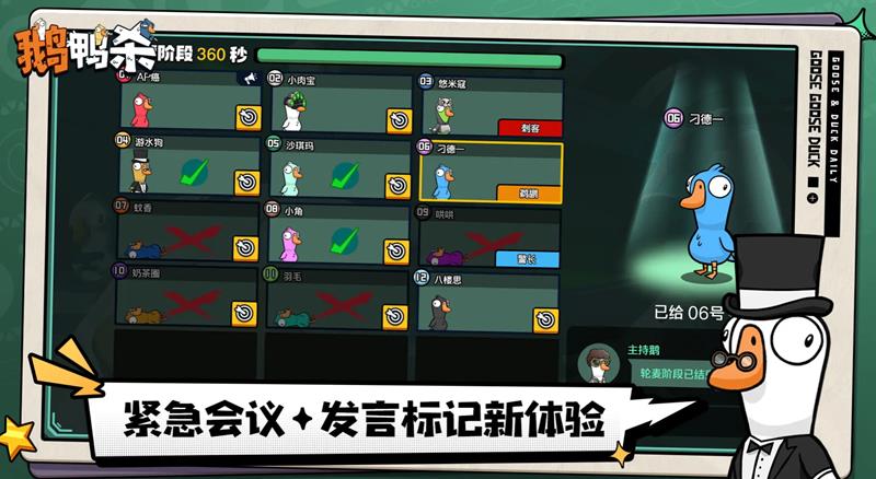 隐形鸭拥有短暂隐身且移动速度提升的特性,适合执行偷袭与侦查任务。可在会议结束后快速接近落单目标,利用隐身突袭完成击杀。同时,隐形鸭也可用于监视大鹅动向,提前预判他们的修缮路线,为队友提供情报支持。使用该角色时需注意隐身冷却时间,合理规划行动节奏,避免暴露在监控或目击者视野中。