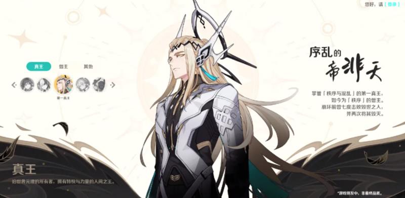帝非天是崩坏因缘精灵中最早确立的真王,被称为第一真王,拥有极强的战斗力。他在崩坏发生前曾两次击败强敌,奠定了其至高地位。然而,随着世界崩坏的到来,原有的力量体系被打破,帝非天的影响力逐渐减弱。尽管如此,他在崩坏因缘精灵的历史中仍占据重要位置,是理解真王体系的关键起点。