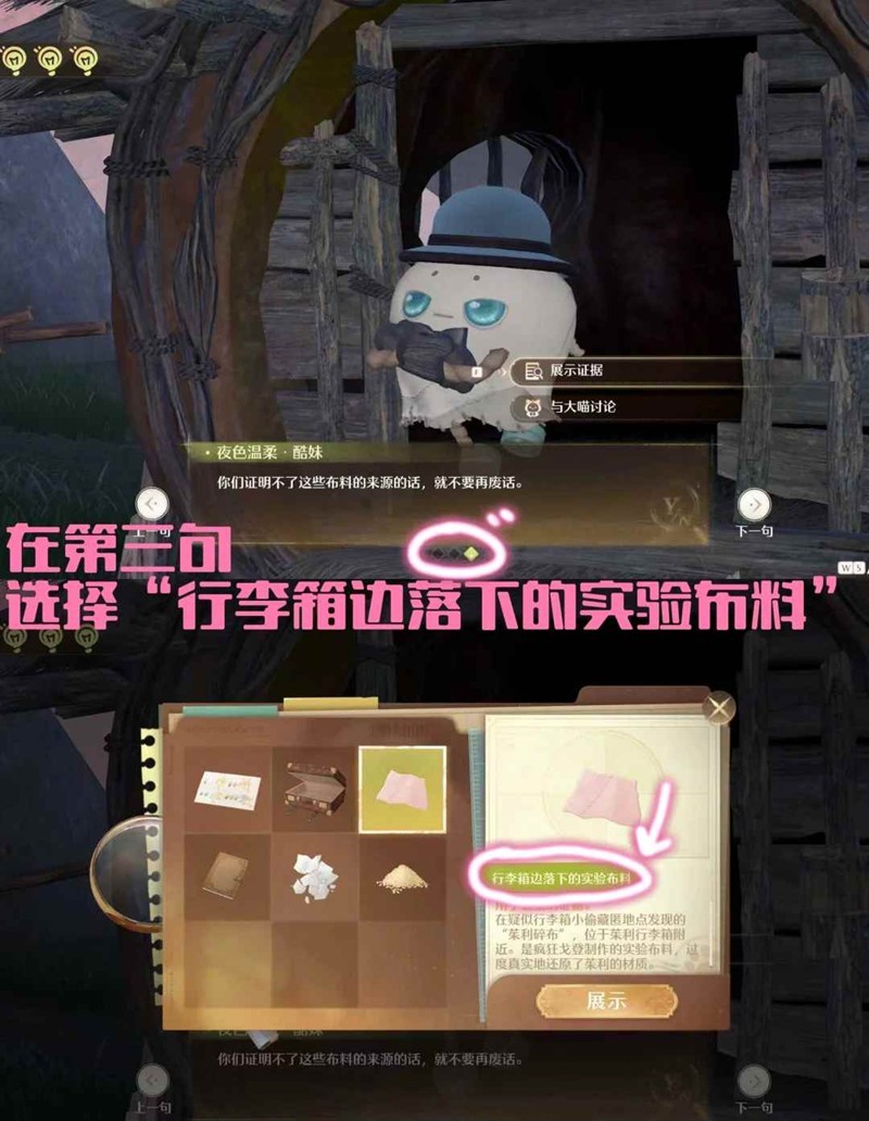在第三句展示证据,选择“行李箱边落下的实验布料”