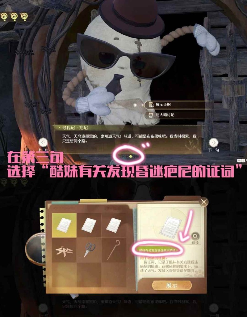 在第三句展示证据,选择“酷妹有关发现昏迷疤尼的证词”