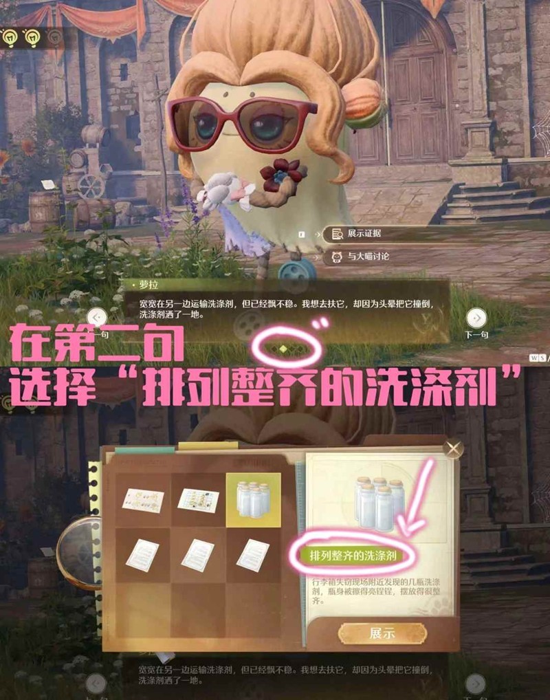 在第二句展示证据,选择“排列整齐的洗涤剂”