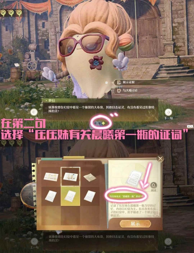 在第二句展示证据,选择“压压妹有关晨曦第一瓶的证词”