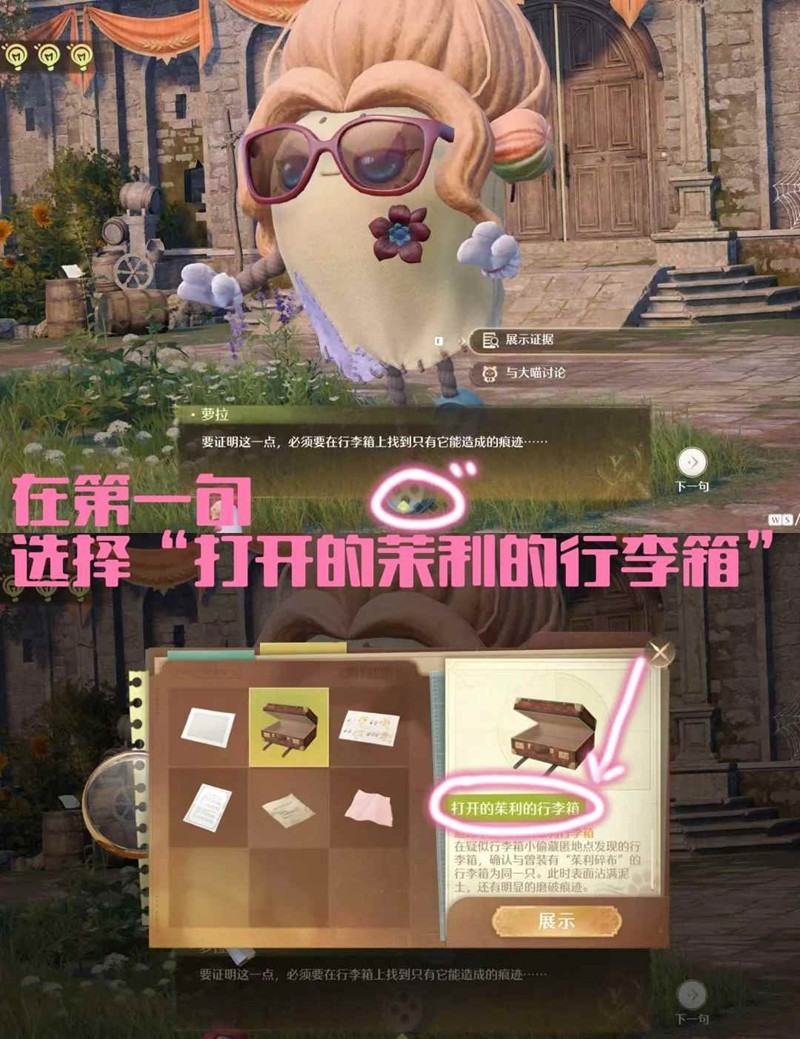在第一句展示证据,选择“打开的茉利的行李箱”