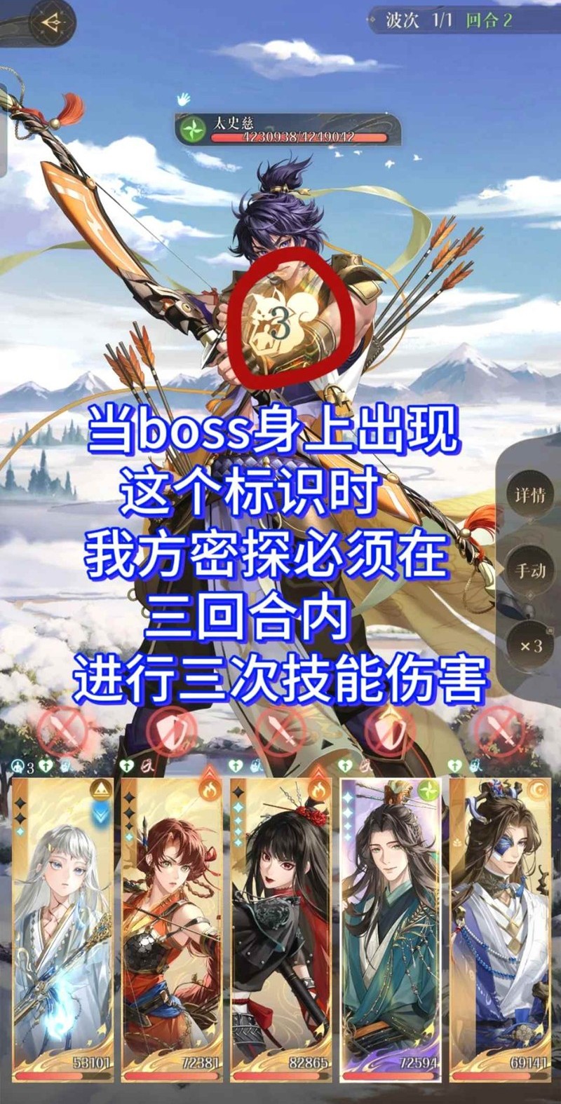 2、我方密探三回合内必须对boss使用三次技能攻击,否则boss会获得一个成果,这个效果每三回合刷新一次,因此不推荐上回能太慢的密探。