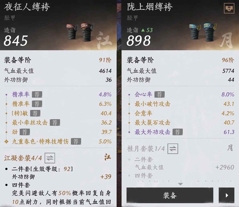 因为右侧装备没有一个词条与左侧装备重复,此时能够最大化提升左侧装备任意一条词条数值比例(满值的4%+1%=5%)。