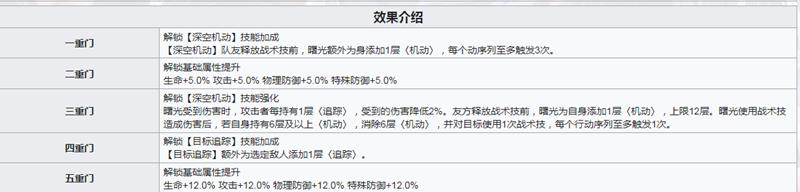 三重门带来的不仅是输出提升,还附带生存类增益效果,能够有效降低曙光所受伤害。这使得她在前线作战时兼具输出与一定的抗压能力。属性成长方面,曙光初始生命值为573点,满级后可达4935点,属于越练越强的类型。二重门进一步提供5%全属性加成,全面提升其战斗表现,无论单挑Boss还是应对群战都有出色发挥。