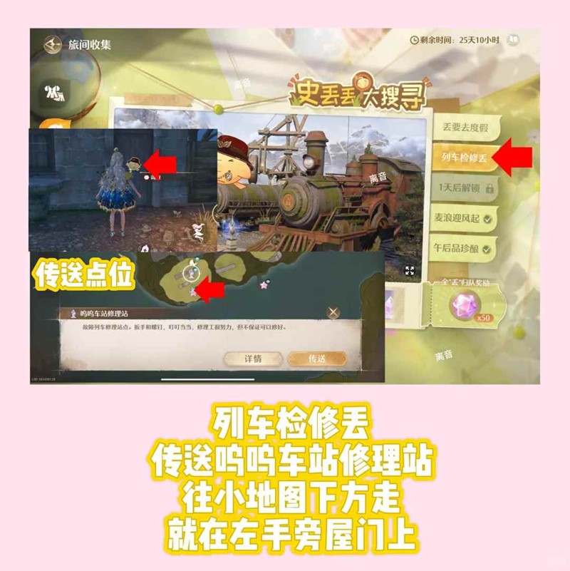 首先是今日史丢丢,传送点位呜呜车站修理站