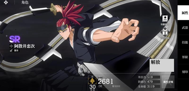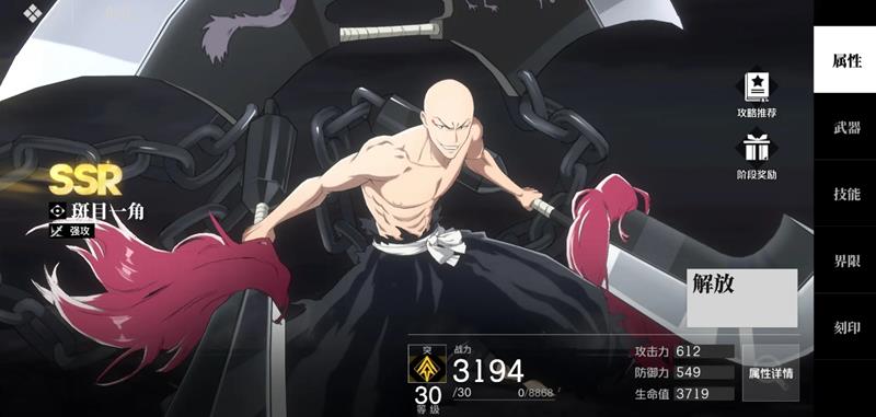 斑目一角在灵压积累满后,长按普攻可释放分支攻击,并在命中后追加一次大范围横扫攻击,清杂能力出色。他的必杀技分为两段,释放第一段即可进入卍解状态,同时获得两次战技能使用机会,期间整体战斗力显著提升。在持续一段时间后或主动再次按下必杀技,可释放第二段终结打击,造成高额爆发伤害。该机制使斑目一角兼具持续输出与瞬间斩杀能力,适合在节奏紧凑的战斗中担任副C或爆发点。