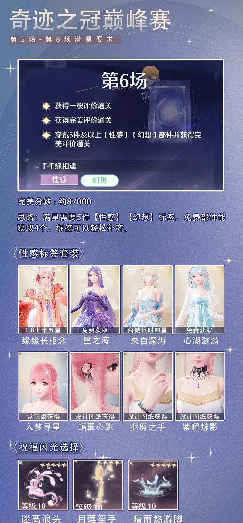 > 第6场符合【性感】【幻想】标签部件的套装有【缘缘长相念】【星之海】【来自深海】【心湖涟漪】,还有单品【入梦寻星】【蝠翼心跳】【扼魔之手】【紫曜魅影】等,可以拿以上任意部件凑标签。