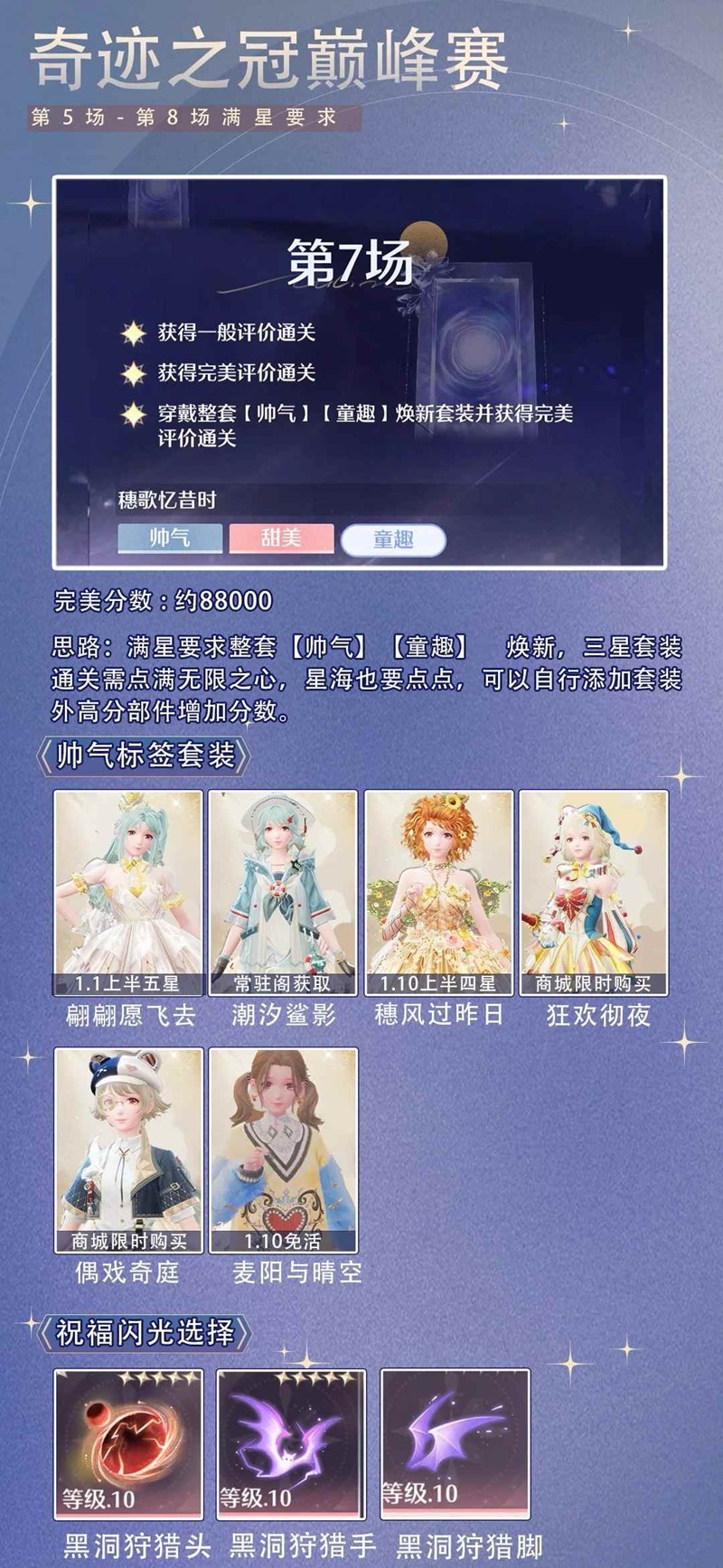 > 第7场符合【帅气】【童趣】标签部件的套装如下图所示,想四星以及三星通关需要多点点无限之心和星海。