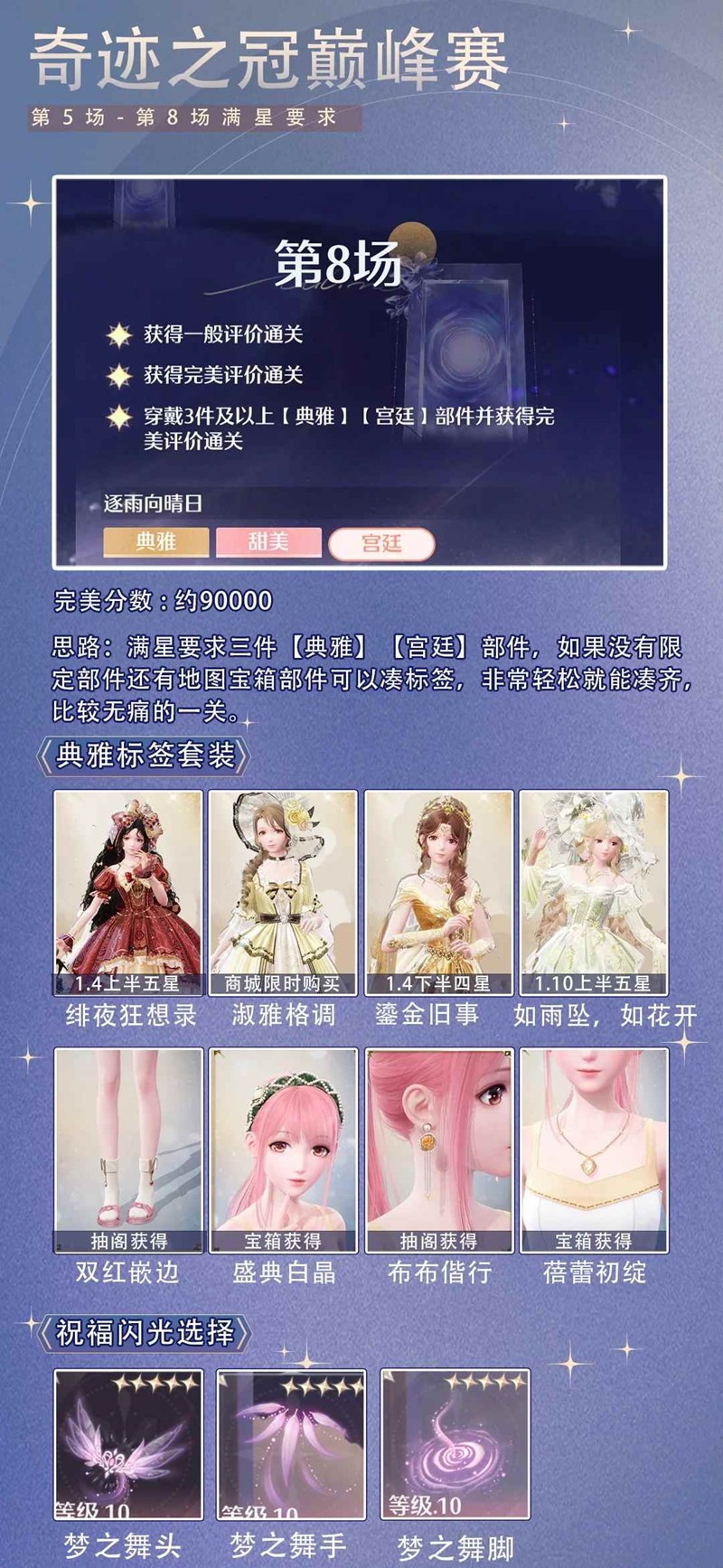 > 第5场符合标签的套装有很多,焕新泡泡套也能过关(无限之心要点点哦)。 【甜美】【宫廷】标签套装有【咏叙的旧梦】、动物邀约套【绿原交响诗】,用动物邀约套焕新过关毫无压力。