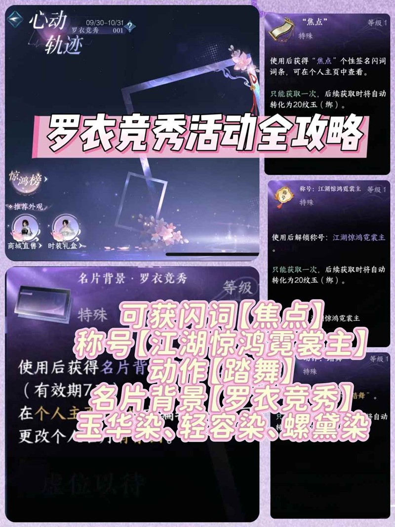 罗衣竞秀每期共有四场活动,活动开始时间为每周五晚上九点,在星梦乐园—星光台—签名板(493 586)报名参加活动。