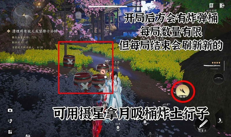 开局后方会有炸弹桶每局数量有限,但每局结束会刷新新的,可用摄星拿月吸桶炸士行子