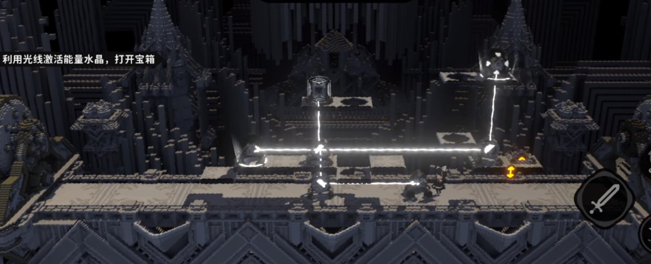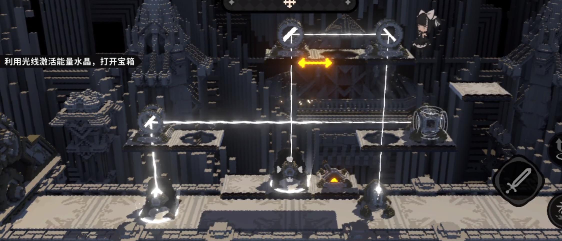 第一关白塔智识层中,玩家进入地图后与入口处的寻宝人互动即可开始游戏。找到交互点并点击交互后朝右移动,利用跳跃按钮来到平台上的第二个交互点,将光线调整到对准宝箱的方向即可完成挑战。