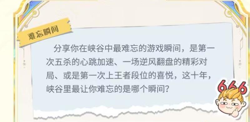 5.王者荣耀十周年,不仅是游戏的庆典,也是所有玩家共同的回忆。让我们一起参与“我的峡谷纪念册”活动,分享那些年我们一起走过的峡谷时光,记录下属于我们的王者荣耀故事。