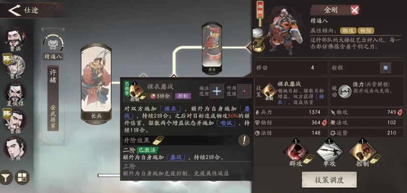 获得武将后,养成系统提供了多维度的成长路径。除了常规的升级、升品和技能强化外,游戏独创的仕途机制允许玩家自定义角色发展方向。通过选择不同的仕途分支,同一武将也能在战斗中承担不同职能。此外,羁绊系统的设定也更为灵活,多数羁绊仅需满足一名核心角色在场,其余上阵武将只要属性和品阶达标即可触发效果,大幅降低了配队门槛,提升了阵容搭配的自由度。