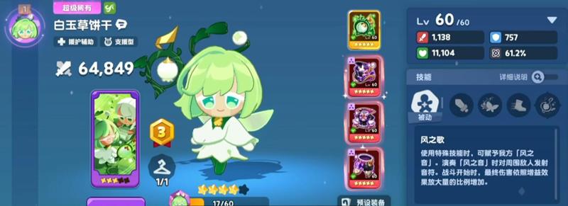 白玉草饼干在饼干人联盟中定位为兼具辅助与一定输出能力的超级稀有角色,满级60级时拥有11104的生命值、1138攻击力和757防御力,基础属性偏向生存向,同时具备61.2%的效果命中,这使得其技能触发更加稳定。高效果命中配合被动机制,能在战斗中持续提供增益与间接伤害,是队伍中不可忽视的功能核心。其生命值保障了在前线的存活能力,而攻击力达到同级别输出饼干的70%,意味着在辅助之余也能贡献可观的附加伤害。