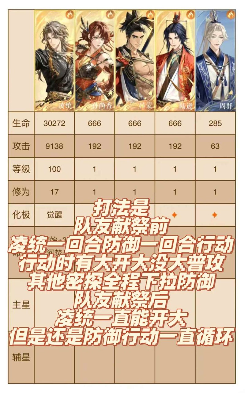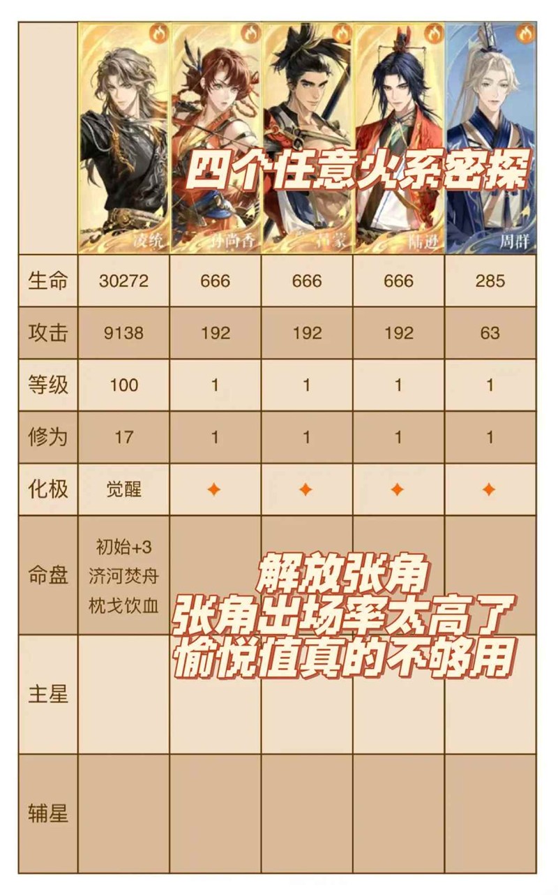 觉醒凌统带四个任意火系密探,也不用升级