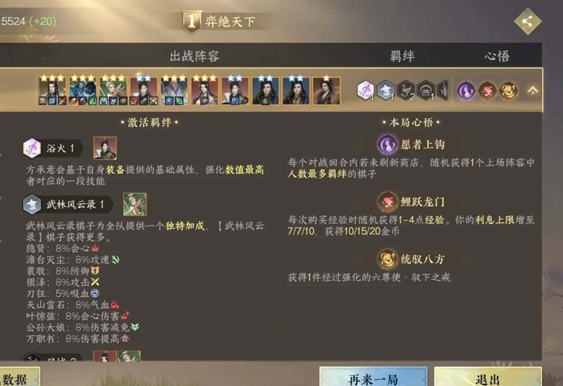 3.阵容选择,前期靠拼多多保住血量不建议走连败,因为3-1没开出好心悟会一直输下去3-1没有鲤鱼/669的话选9武林心悟,万物皆可拼9武林。