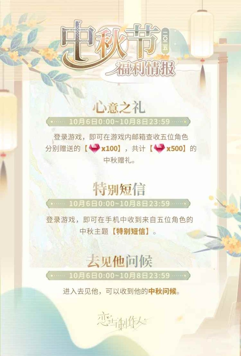 恋与制作人2025中秋节福利情报公开~登录游戏可获得中秋赠礼~10月6日-10月8日,登录游戏,可在游戏内邮箱查收他们分别赠送的【钻石*100】,共计【钻石*500】的中秋赠礼。一起来和小编看看吧~