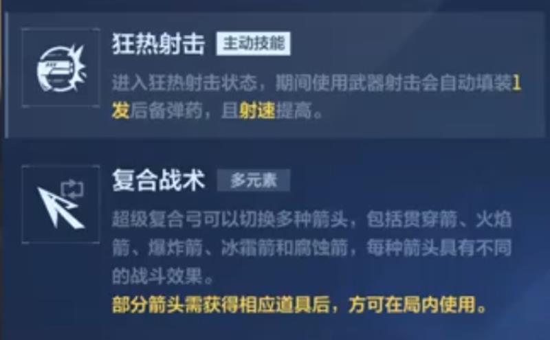 复合弓的技能之一为狂热射击,当武器进入该状态后,在持续时间内使用主武器进行射击,可自动补充1发后备弹药,并提升整体射速。这一机制使得复合弓在连续作战中具备更强的续航能力,尤其适合搭配高爆发或高频率输出的主武器使用,在面对大量敌人时能有效维持战斗节奏。