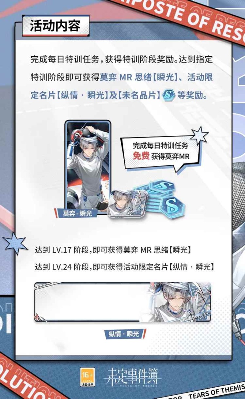 活动期间,律师可通过选择不同的「提供补给」方案完成每日特训任务,获得特训阶段奖励。达到指定特训阶段即可获得莫弈MR思绪【瞬光】、活动限定名片【纵情 · 瞬光】及【未名晶片】等奖励