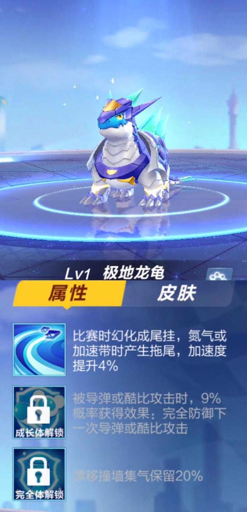 极地龙龟在道具赛中表现突出,除了基础的加速度提升和撞墙集气保留外,最核心的特性是被导弹和酷比攻击时有概率完全防御下一次攻击。这个技能在道具赛中极为实用,目前可以通过游戏内抽奖获得,是道具赛玩家的首选宠物。