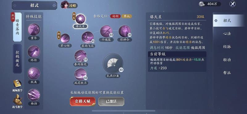可以放置傀儡,玩家可以自由选择傀儡的位置,灵活性很高。傀儡放置后会激活爆天星技能,能够将范围内的敌人击飞,在被敌人近身攻击时使用可以有效打断对方技能。形神合是唐门的强化技能,能够提升其他技能的威力。