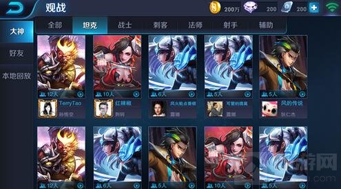 进入观战系统可以看到左侧有三个切页,分别是大神观战、好友观战和本地回放。