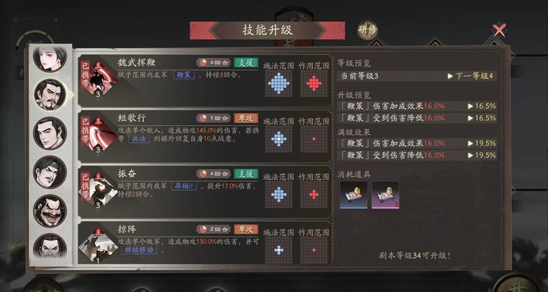 在技能加点方面,优先解锁群雄线的魏武挥鞭技能,该技能不仅能造成范围伤害,还能为全队附加16%的增伤与减伤效果,是开荒阶段的核心增益技能。随后应点出重骑兵线的天下归心,这是游戏中唯一的光环类技能,可提升菱形两格范围内单位10%的战法伤害。建议先将重骑兵线升至40级以解锁天下归心,再补足群雄线的魏武挥鞭等级,最后点出雄志(超世之杰)技能,为全队提供10%的攻防加成,弥补兵法类技能持续时间不足的问题,且能与天赋效果叠加。