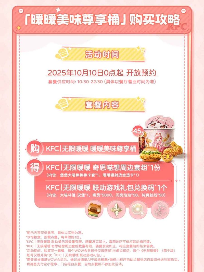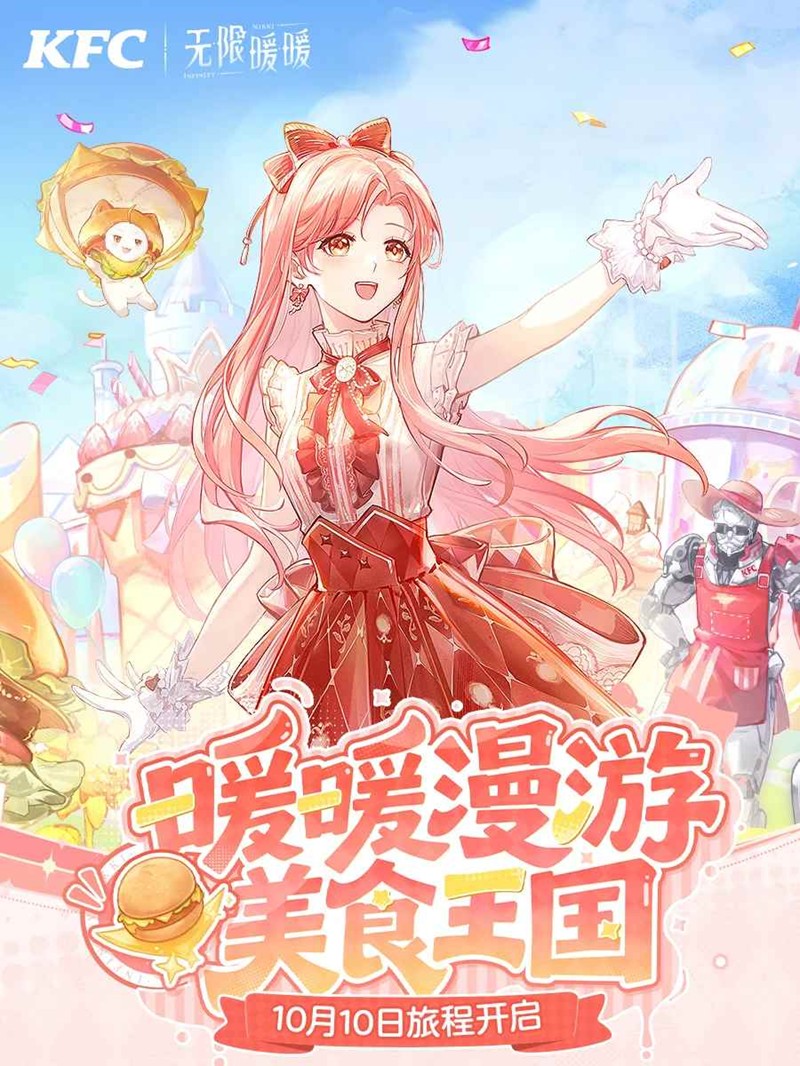 搭配师们,请收下这份漫游指南~10月10日,肯德基x无限暖暖联动即将开始!锁定KK频道「暖暖漫游美食王国」,快来跟随少女与喵加入这场美食王国的奇妙旅程!一起来和小编看看吧~